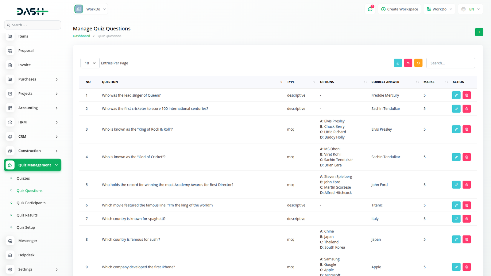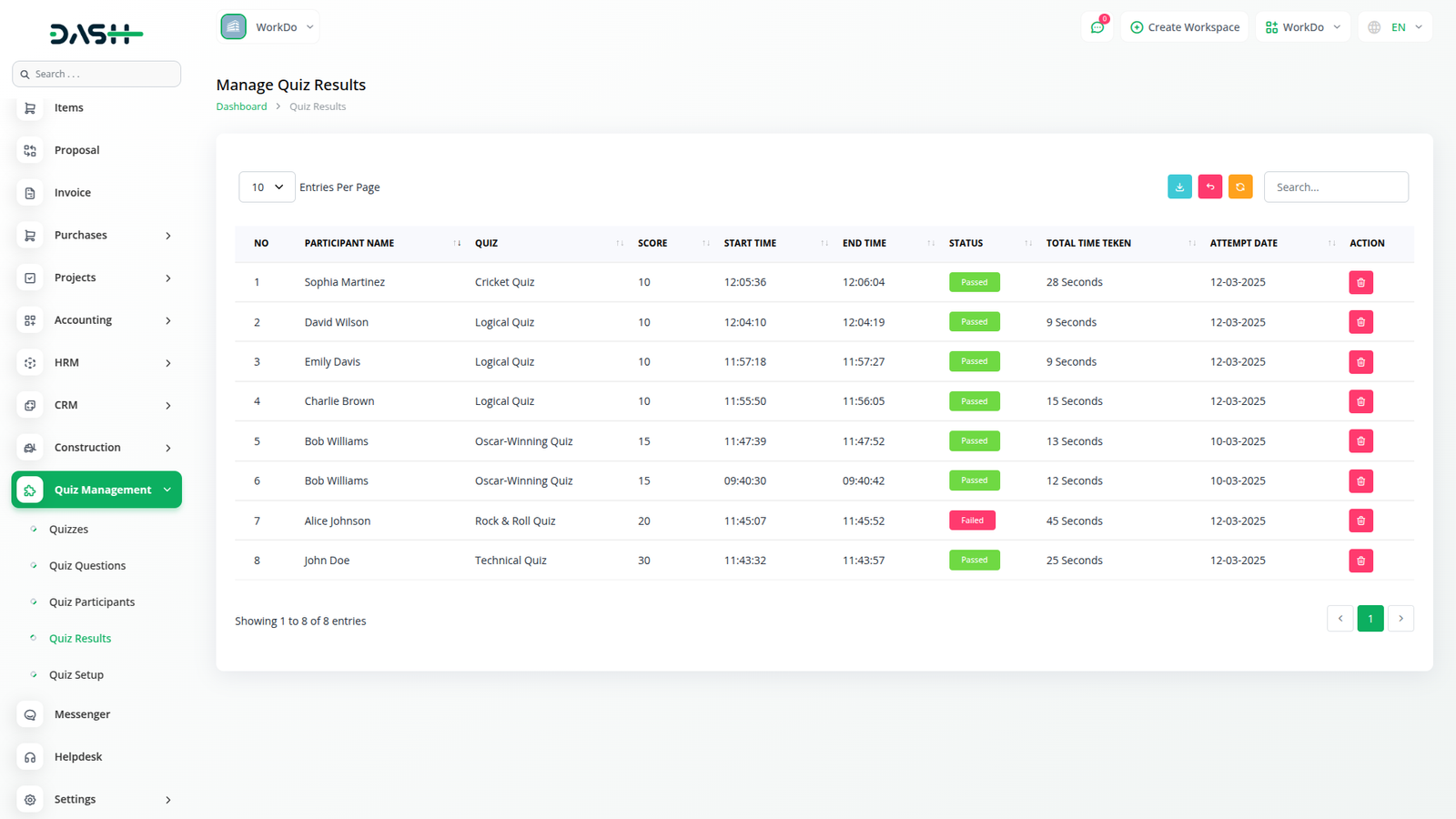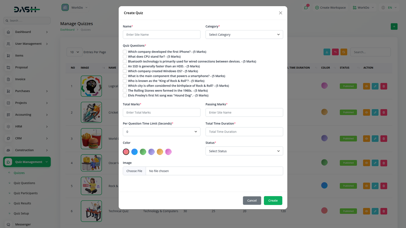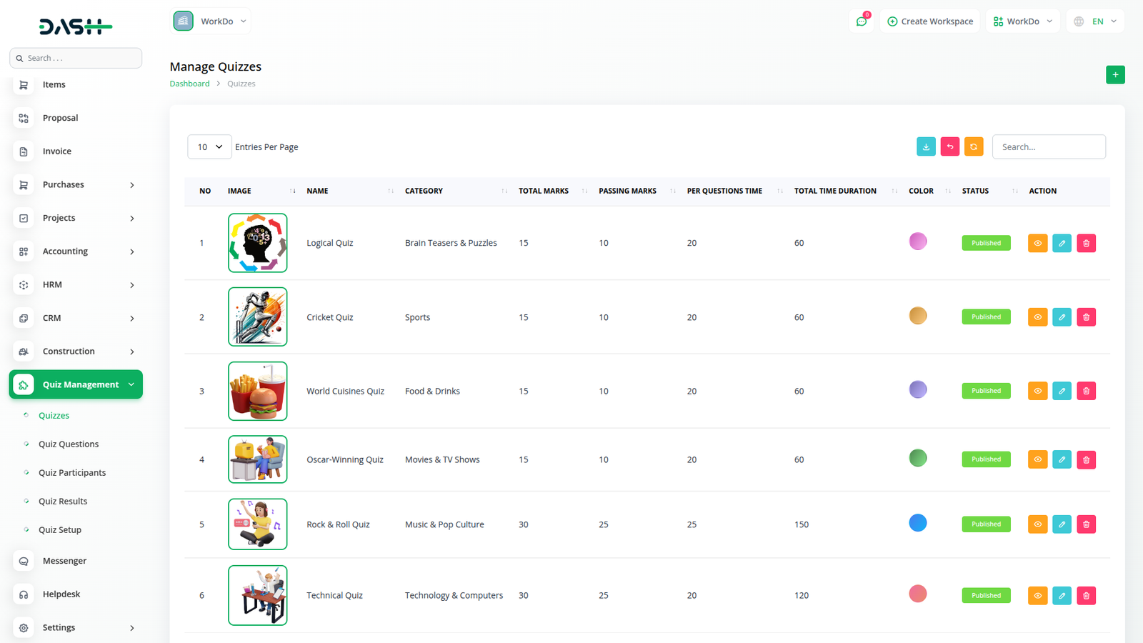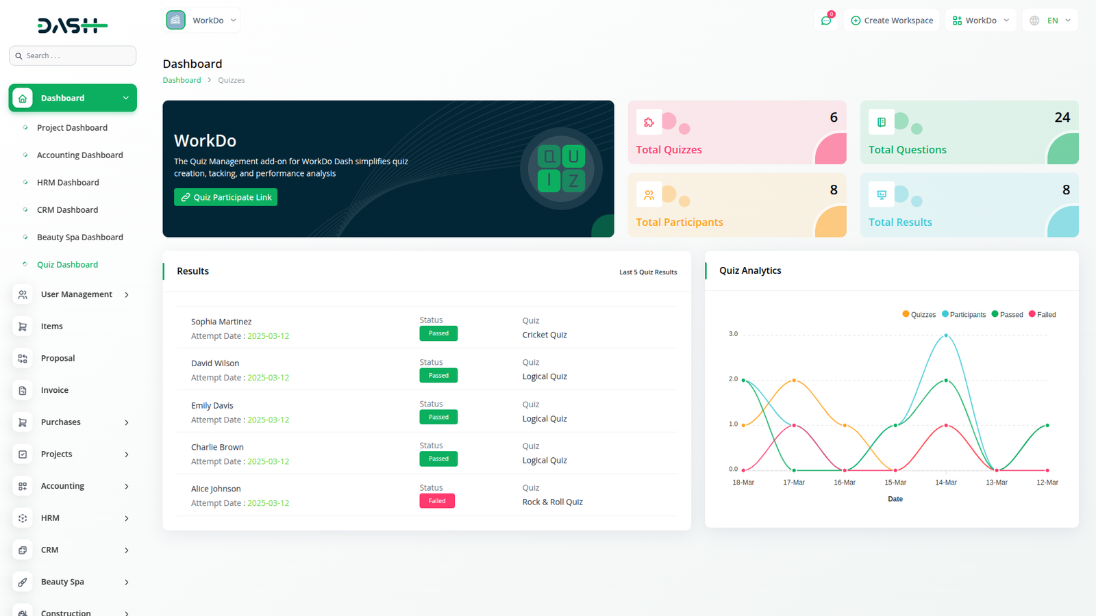 Manage quizzes, track progress, and enhance participant engagement effortlessly with Workdo Dash's Quiz Management Module.